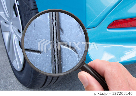 自動車のタイヤの溝の深さをデプスゲージで測る