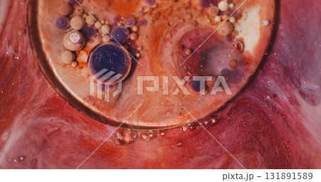 Ink stream. Oil bubbles. Defocused orange purple vibrant color glitter acrylic fluid round emulsion floating on abstract background.
