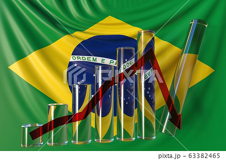 Glass bar chart with downward trend against flag of Brazil. Financial crisis or economic meltdown related conceptual 3D rendering