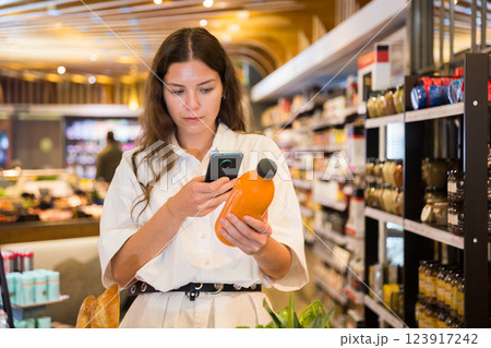 Focused girl chooses carrot juice in a supermarket, studying its composition on the bottle