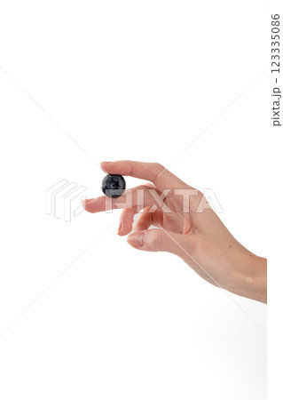 on white photo background between female fingers, ripe blueberry, healthy vitamins, seasonal summer fruit, vitamin C, forest and bush berries