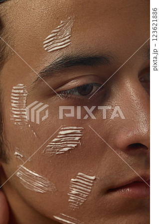 Close-up of young man face with skincare cream highlighting smooth radiant skin against neutral studio background.