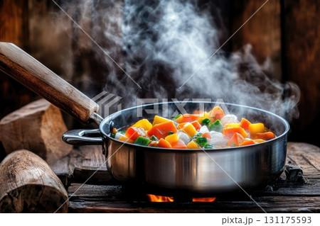 Steaming pot of vibrant vegetables cooking on stove with fresh ingredients