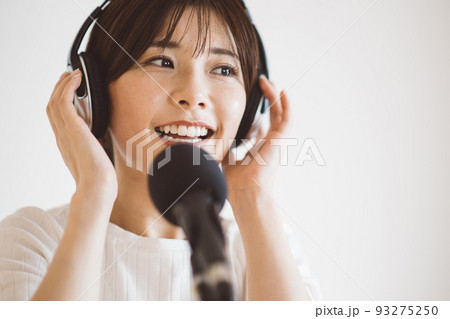 マイクを持ってボーカルレッスン、カラオケやボイストレーニングする女性 習い事や司会などのイメージ