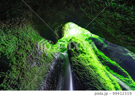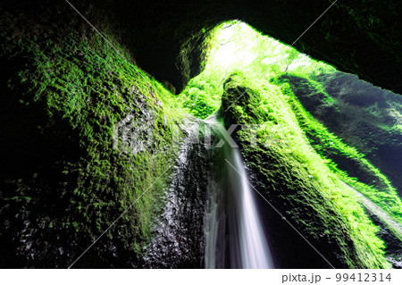 洞窟に流れ込む神秘的な滝 シワガラの滝3 兵庫県美方郡新温泉町