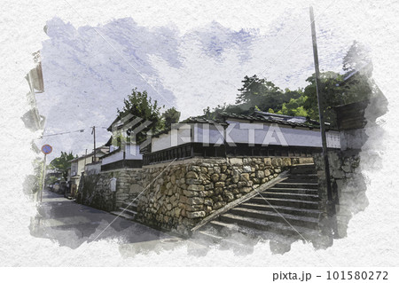 水彩画風 宮島 滝小路 広島県廿日市市