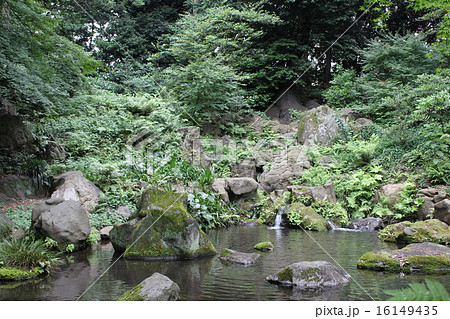 新緑が美しい春の六義園(滝見茶屋から見た滝や水分石)