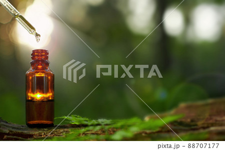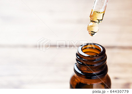 Drop of essential oil falls from a pipette into a cosmetic bottle