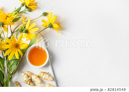 Jerusalem artichoke syrup in bottle, flowers and root.