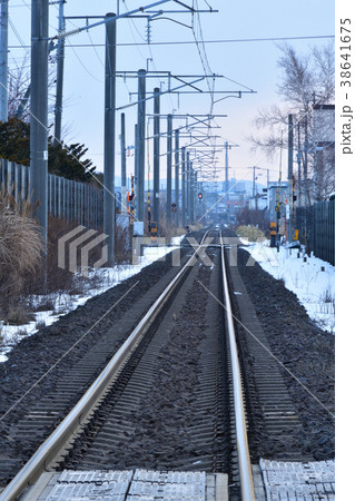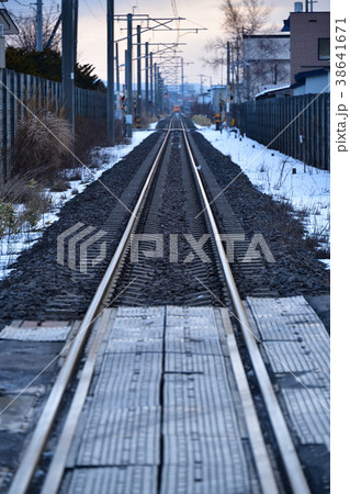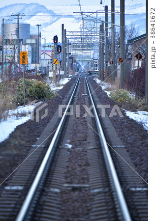 冬の旧江差線漁り火鉄道の線路の風景を踏切から撮影