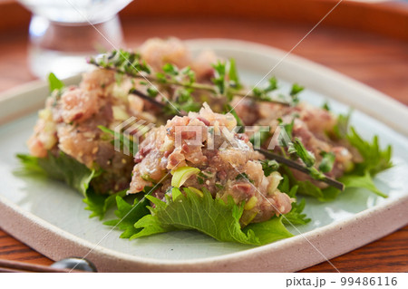 鯵を沢山叩いて作った郷土料理のなめろうを白背景で撮影