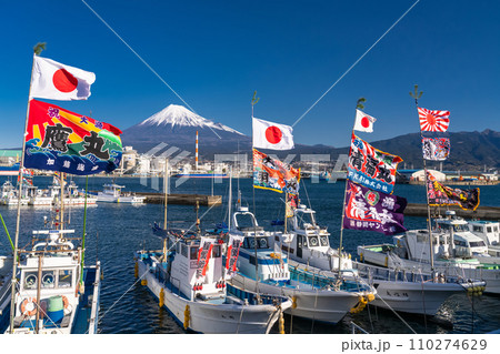 《静岡県》富士山と大漁旗を掲げる漁船・新年を迎える田子の浦港