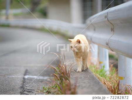 漁港沿いの道路をお散歩する猫