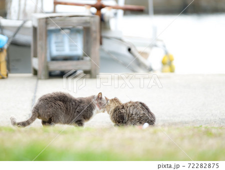 漁港近くでそっと寄り添う二匹の猫