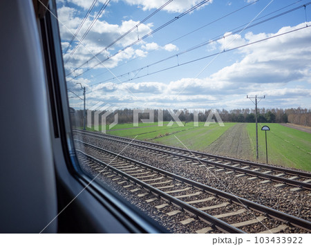 【ポーランド】郊外を走る鉄道の車窓から望む広大な田畑と雲が漂う空