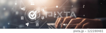 Woman working on laptop and tablet productivity checklist and filling survey form online. Document management system DMS. Assessment form, questionnaire, Checklist and clipboard task management.