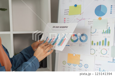 Diverse female accountant analyzing a bar chart infographic on a presentation board in an office.