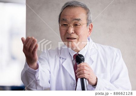ビジネス マイクを持ってスピーチをするシニア男性