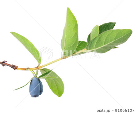 Honeysuckle twig with green leaves isolated on white background. Ripe berries of honeysuckle. Clipping path.