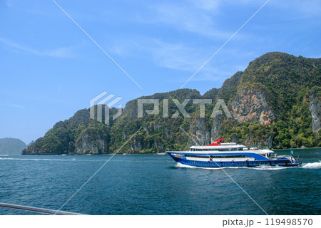 Tropical summer sky and blue ocean water surround a stunning Thailand island rock landscape