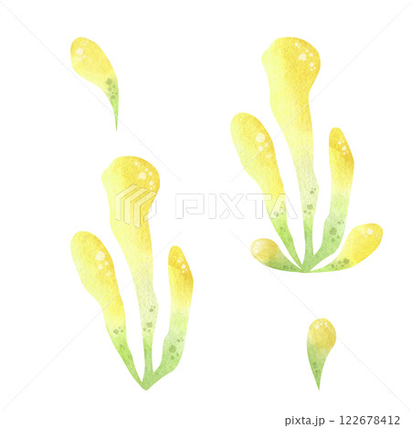 Seaweed, oceanic algae watercolor isolated illustration set in cartoon style. Sketch of marine flora. Hand drawn sea underwater plant in yellow green colors for kids sea design and nautical print.
