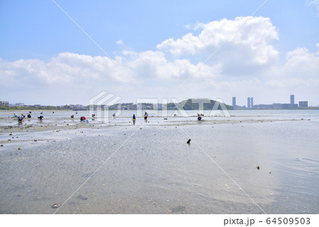 潮干狩り 福岡市東区塩浜海岸 博多湾 遠望はアイランドシティ