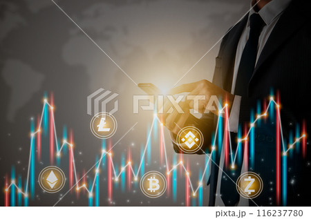 Businessman Hand and Finger Touch Mobile Phone and Color Stock Graph and Cryptocurrency