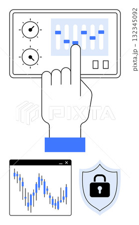 Hand operating sliders on a control panel, security shield with lock, financial chart. Ideal for technology management, cybersecurity, finance, data analysis, software control, security protocols