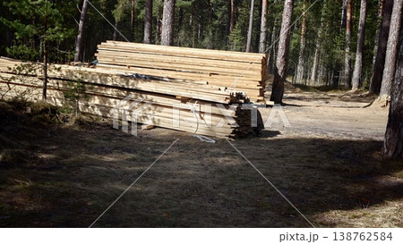 Timber stacked in a forest clearing under a clear sky on a sunny day