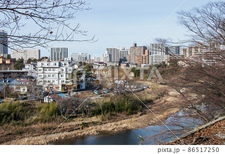 杜の都仙台 広瀬川 冬 澱橋から下流の澱緑地、澱淵とビル群を望む