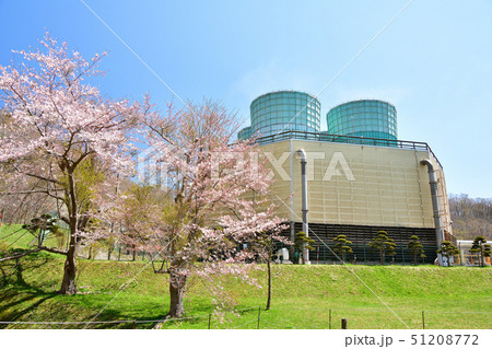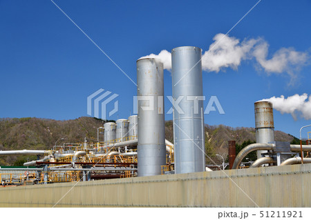 快晴の北海道森町北海道電力濁川地熱発電所の蒸気変換工場の春の風景を撮影