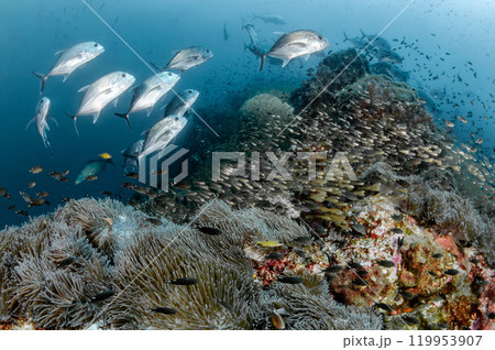 School of Giant trevally fish and glassfish swimming over coral reef at Richelieu Rock