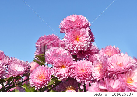 晩秋の秋晴れの日差しを浴びて輝くピンクの菊