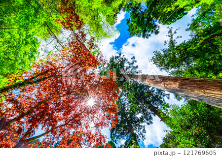 鞍馬寺の春に紅葉するノムラモミジと光条