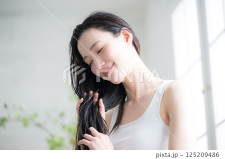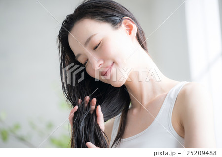 若い女性の濡れた髪のヘアオイルを塗るトリートメント 毛先の枝毛などをケアするイメージ