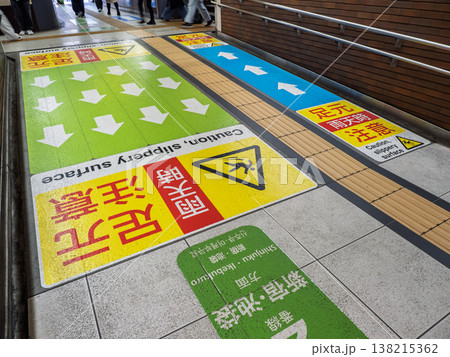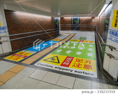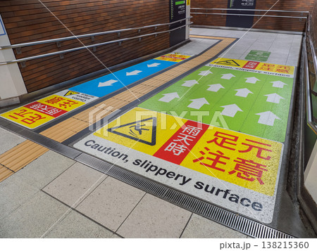 雨天時の転倒防止を促す駅通路の足元注意表示と通行誘導サイン