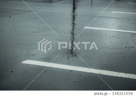 雨に濡れたアスファルトの路面と水面に映る電柱の反射