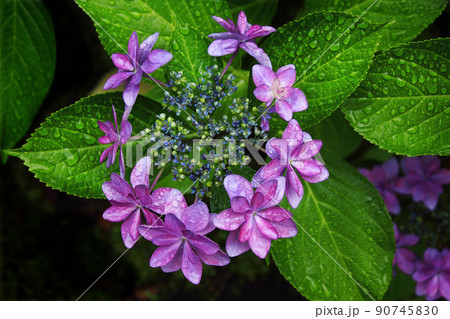 紫陽花の花を囲み、ガクは線香花火のようにして派手に雨に濡れながら