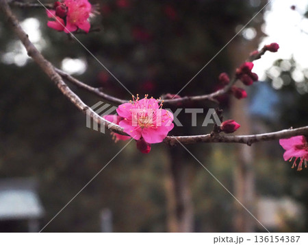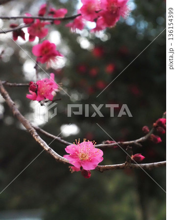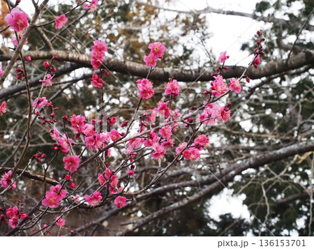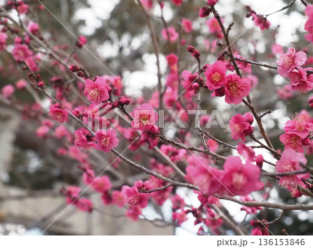 たくさんの花とつぼみをつけたウメの枝(瀧皇神社の紅梅)
