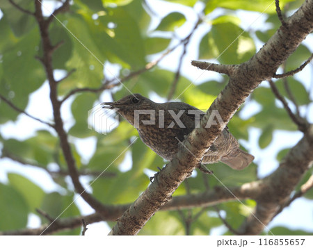 桜の枝の上にとまって鳴くメスのイソヒヨドリ(雌の磯鵯のクローズアップ)