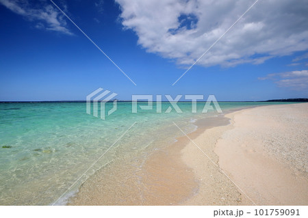 沖縄県国頭郡本部町瀬底 小さな離島水納島の水納ビーチからの水納ブルーの海が広がる景色