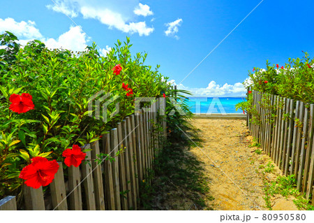沖縄のイメージ 青い海と青い空と真っ赤なハイビスカス