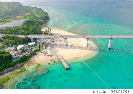 沖縄の青い海と離島を空撮(瀬底島アンチ浜)