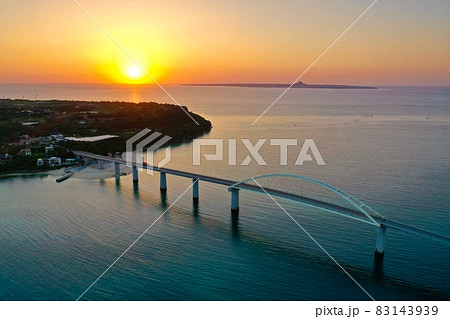 沖縄県国頭郡本部町渡久地 濱元橋から眺める水納島のシルエットに沈む夕陽