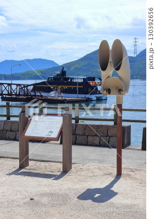 大久野島のウサギの耳型集音器と桟橋に停泊中の観光船(広島県竹原市)