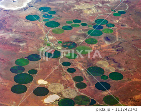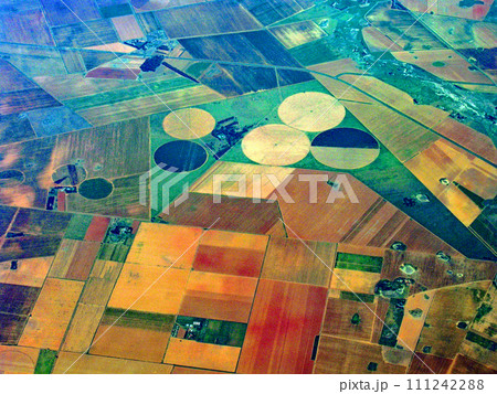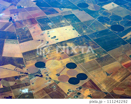 飛行機から見たセンターピボット灌漑による円形の農地 アメリカ合衆国