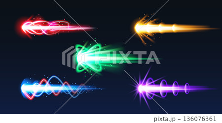 Laser and plasma blaster gun game effect of cartoon energy blast or fire beam, vector VFX set. Laser gun or plasma blaster game effects of lightning or magic energy blasts with flame shot or fireball