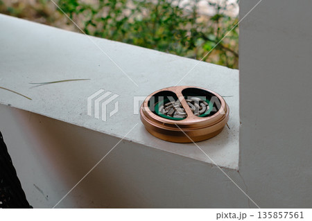 屋外で蚊取り線香を蚊取り線香入れに入れて使うイメージ