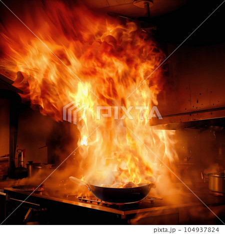 火のついた鍋を放置したために火災が発生中。AI生成画像