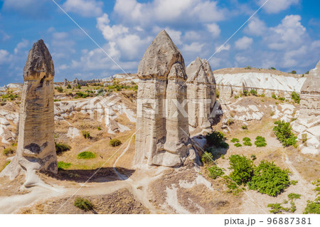 Unique geological formations in Love Valley in Cappadocia, popular travel destination in Turkey